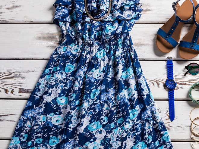 Vestitino estivo con stampa floreale nei toni del blu. Modello corto. Stampa floreale. Arricciatura in vita.